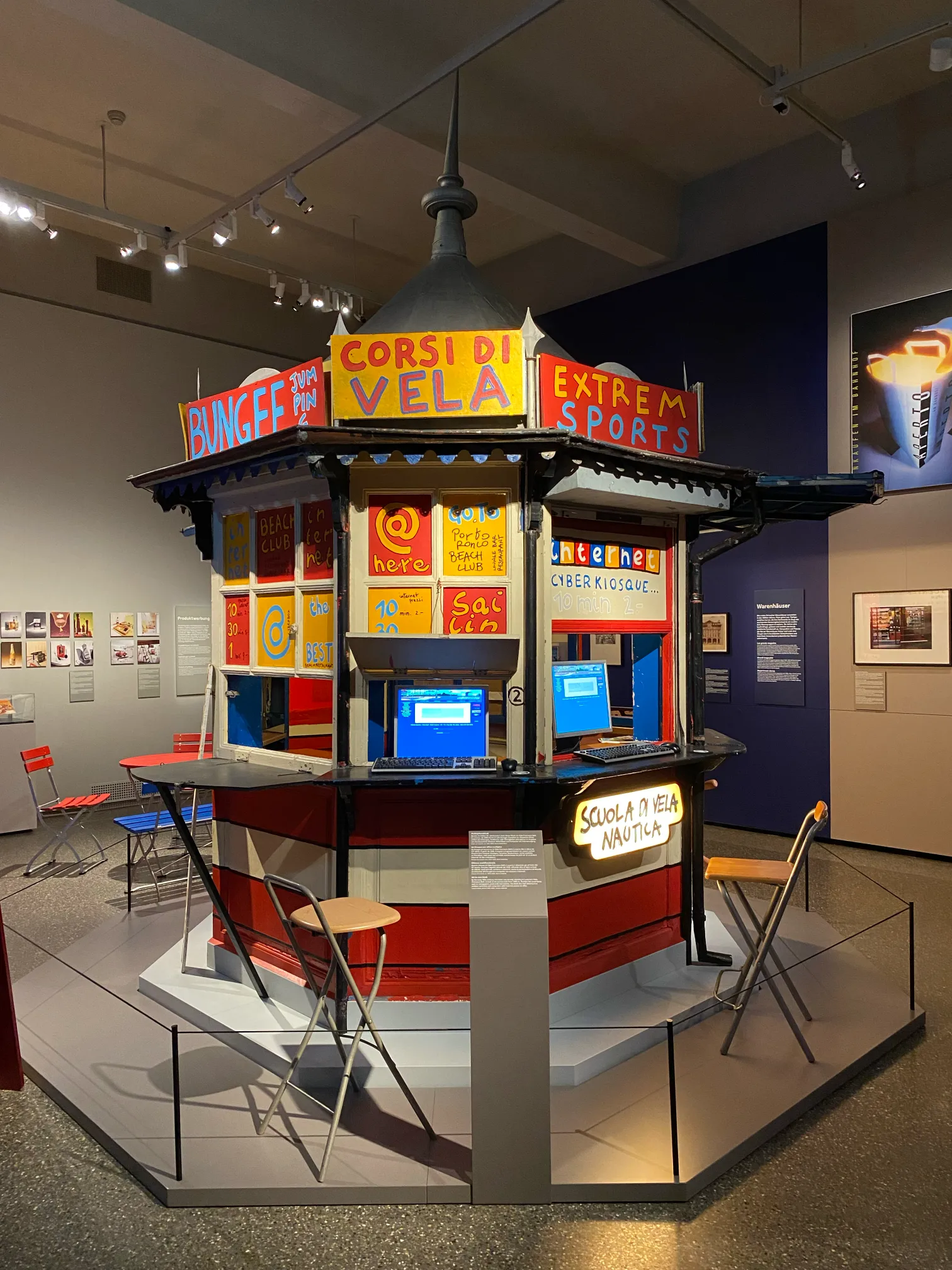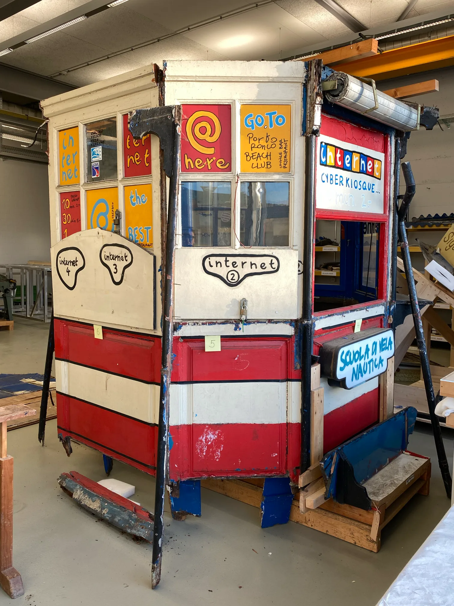 Für die langfristige Erhaltung und die Präsentation des Kiosks in der Ausstellung «Konsumwelten. Alltägliches im Fokus» (schweizerisches Landesmuseum Dezember 2024-April 2025) waren umfassende Restaurierungs- und Konservierungsarbeiten erforderlich. Um den Kiosk ausstellbar zu machen und die damit verbundenen Sicherheitsanforderungen zu gewährleisten musste neben vielen Reinigungs- und Festigungsarbeiten der Farbschichten vor allem das im Sockelbereich komplett verfaulte Holz vollständig ersetzt werden. Eine zerstörungsfreie Restaurierung ohne Eingriffe in die Originalsubstanz war leider nicht möglich. Es galt jedoch bei jedem Eingriff «So viel wie nötig, so wenig wie möglich». Der Kiosk wurde im Zustand von 2008, seinem letzten Betriebsjahr, erhalten. Durch seine Nutzung als «Visitor-Center» und Internetstation noch vor der grossen Smartphone-Revolution ist er ein wichtiger Zeitzeuge der 2000er-Jahre. Jede Rückführung auf eine vorherige Zeit hätten einen Teil seiner Geschichte zerstört.