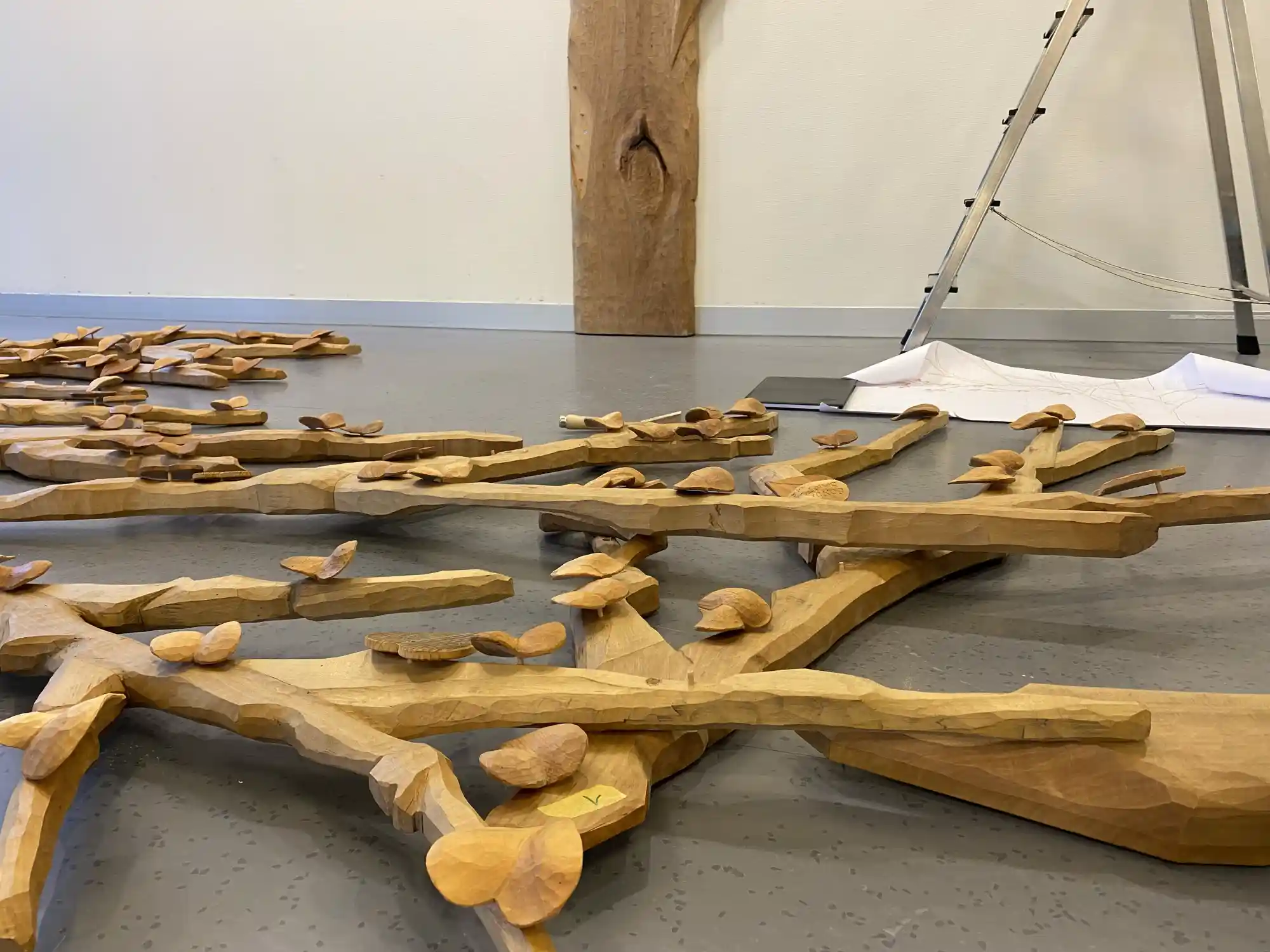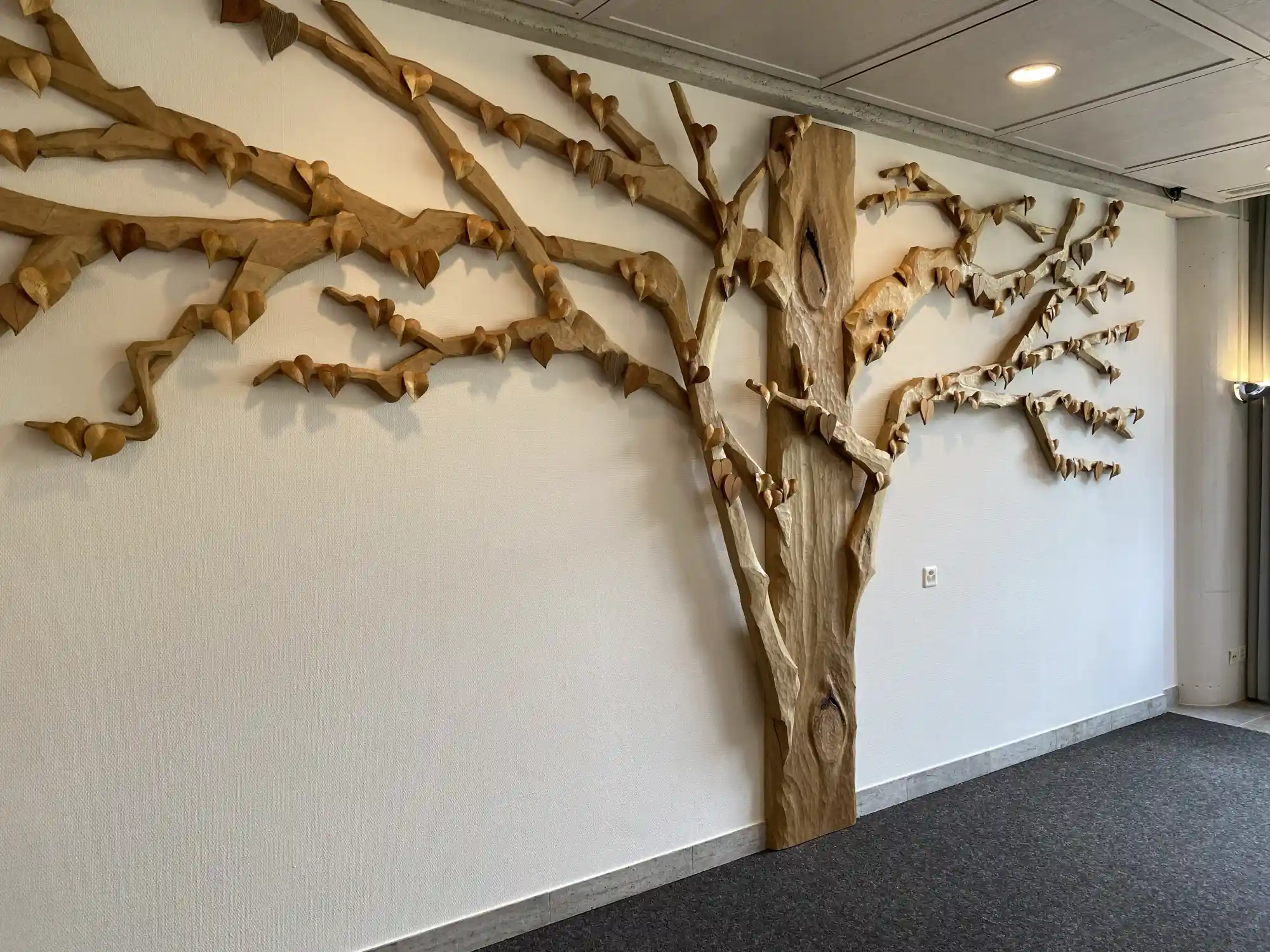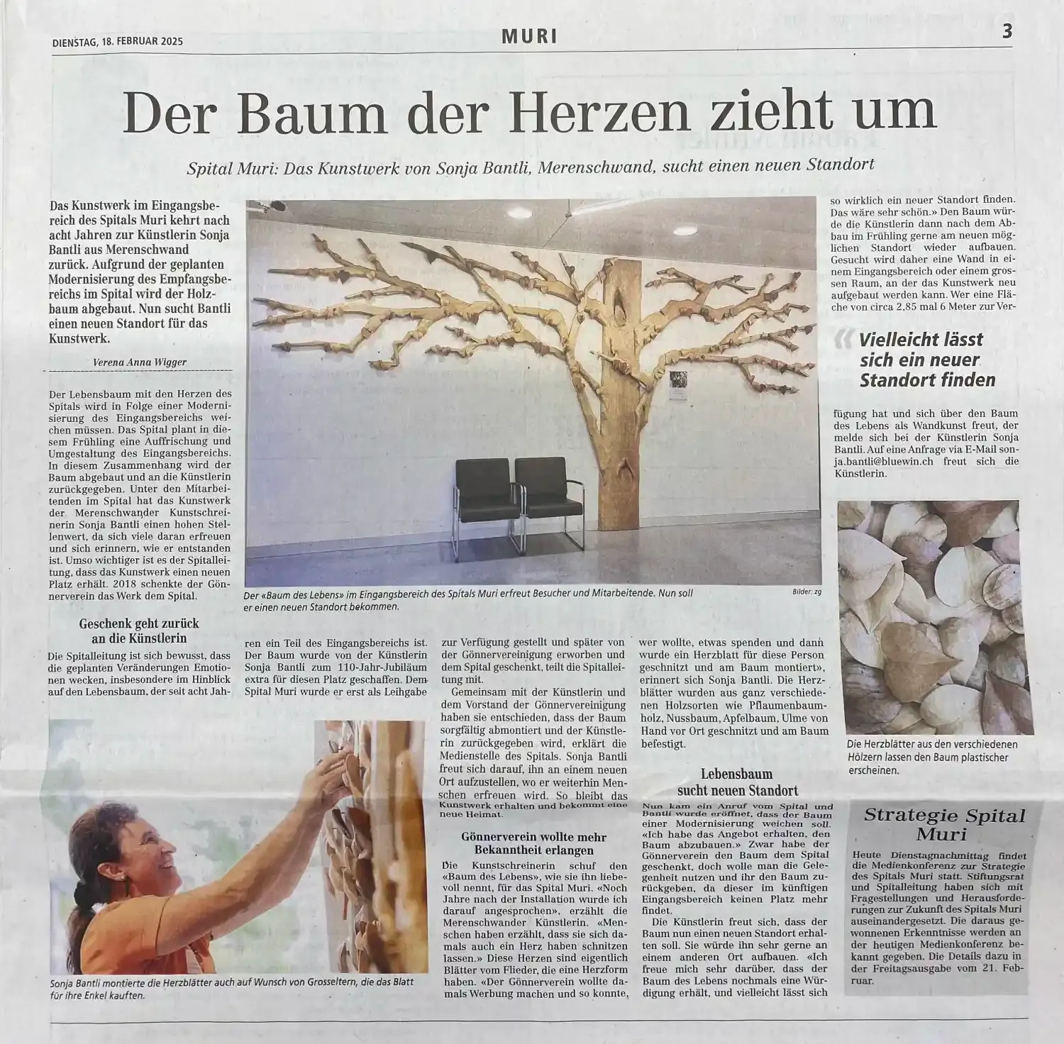 2018 wurde ich anlässlich des Jubiläums des Spital Muri AG beauftragt, einen Blickfang für die Wand im Eingangsbereich zu realisieren. Es entstand der Baum der Herzen. Während der Festlichkeiten konnten die anlehnend an die Form von Fliederblättern in verschiedenen einheimischen Holzarten geschnitzten Herz-Blätter für einen symbolischen Betrag von den Besuchern erworben werden. Darauf wurden die Blätter direkt an der vom Käufer gewünschten Stelle am Baum angebracht. Patienten, Angehörige, Mitarbeiter und Besuchende hatten somit ihre unterschiedlichsten Erinnerungen an den Baum, sodass sie sich bei einem Besuch im Spital Muri mit dem Werk verbunden fühlten. Umso grösser war der Aufschrei, als die Spitalleitung 2025 beschloss, den Baum abzubauen und an mich zurückzugeben, oder zu entsorgen. Mit Hilfe der Presse suchte ich darum umgehend einen neuen Platz. Zu aller Beteiligten Freude konnte dieser schnell gefunden werden. Seit Juli 2025 steht der Baum des Lebens nun im Alters- und Pflegeheim im Brühl in Spreitenbach und erfreut die Gäste der Cafeteria. Ohne grosse Anpassarbeiten konnte der Baum «umgesiedelt» werden und wirkt, als ob er von Anfang an für diese Wand bestimmt gewesen war. Hier wird der Baum nicht nur als Dekoration, sondern als auch als Ausdruck einer Haltung gesehen: das Leben in jeder Phase zu würdigen und zu schützen.