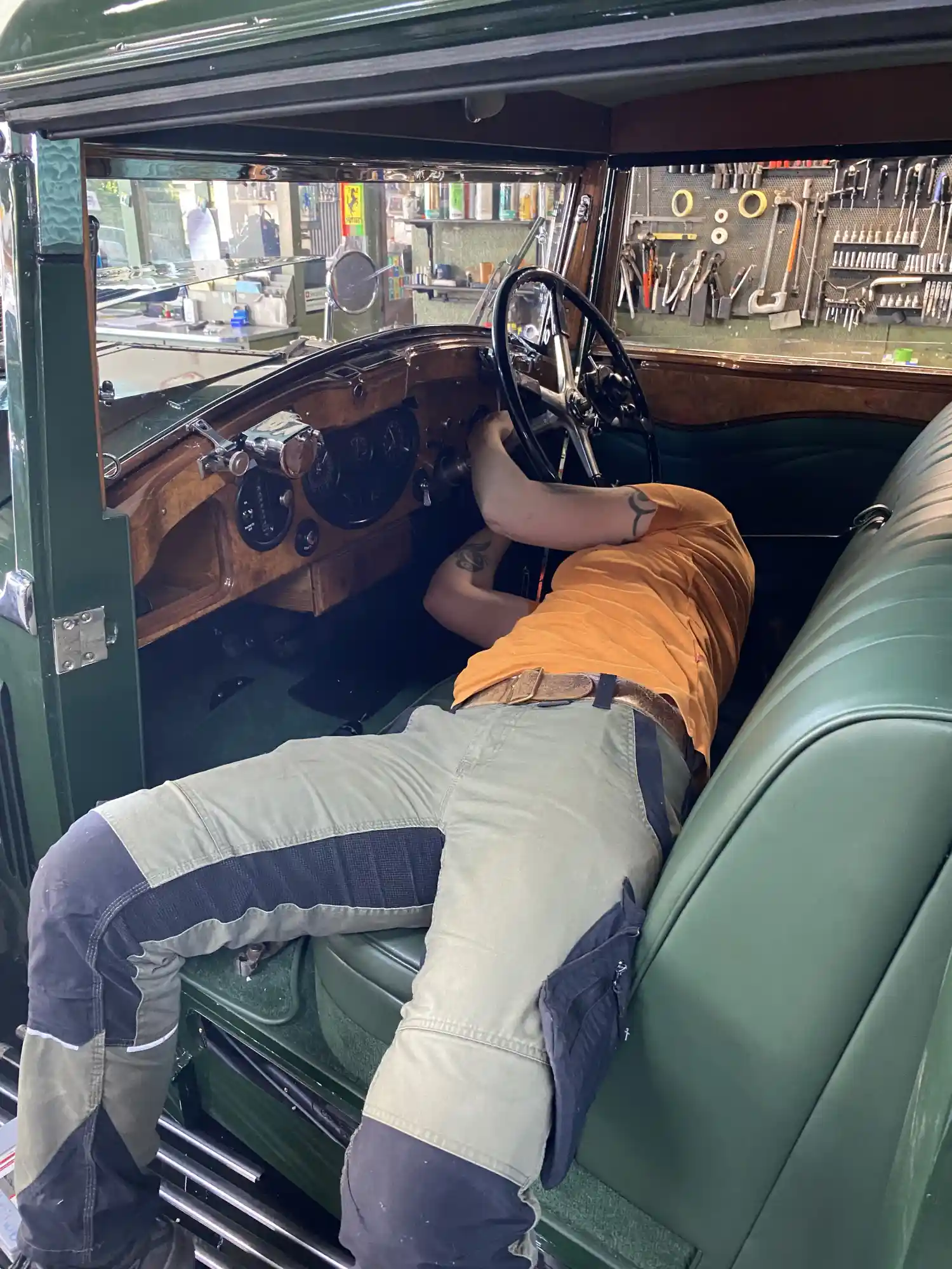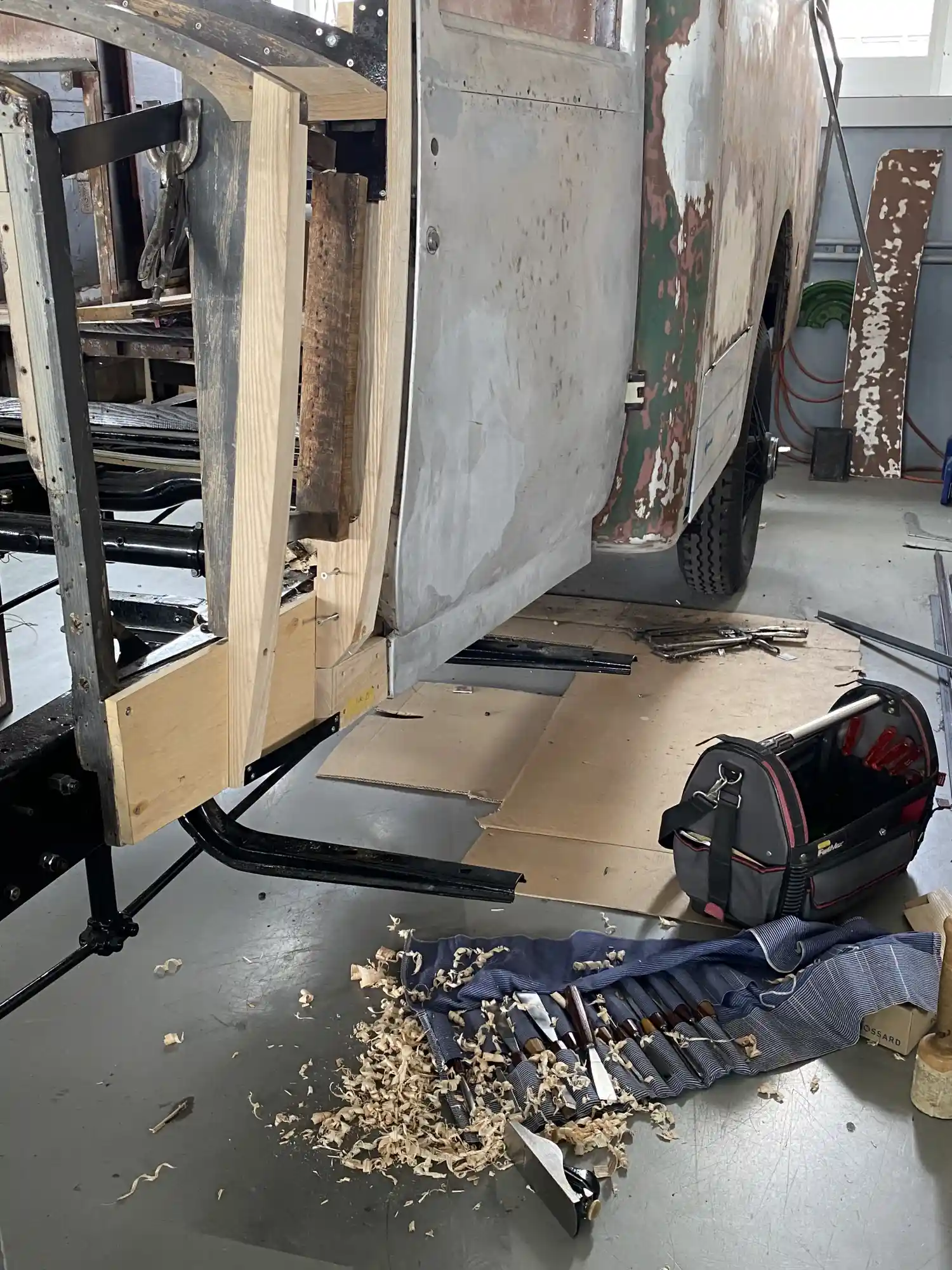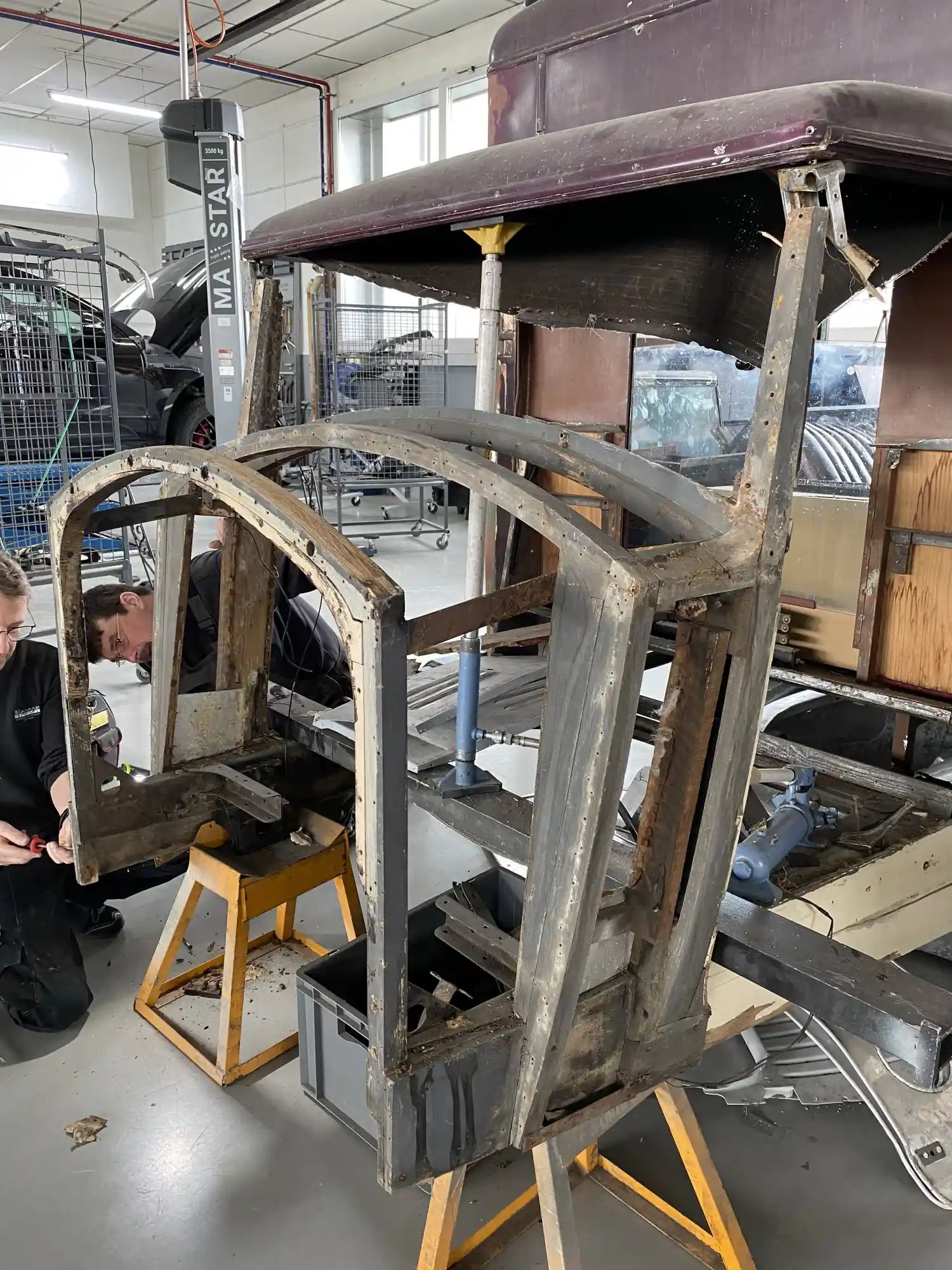 Mehr zu diesem Kurs →2024 durfte ich das Untergestell des Motorraums des Rolls Royce Instand stellen. An Auto’s aus dieser Zeit lässt sich die Kutschenbauweise noch gut erkennen. Die Untergestelle sind aus Holz und wurden mit Blechen überzogen. Das Eschenholz des Rolls Royce war an mehreren Stellen stark oder gar vollständig verfault und musste neu hergestellt werden. Dabei wurde aber trotzdem so viel wie möglich Originalholz belassen. Der anfängliche Eindruck, dass das Untergestell ja nur aus ein paar einfachen Kanthölzern besteht, erwies sich schnell als trügerisch. Keine einzige Fläche war im selben Winkel zu der nächsten und im rechten Winkel schon gar nicht. Eine wahre Kunst des An- und Einpassens und nichts für schwache Nerven…