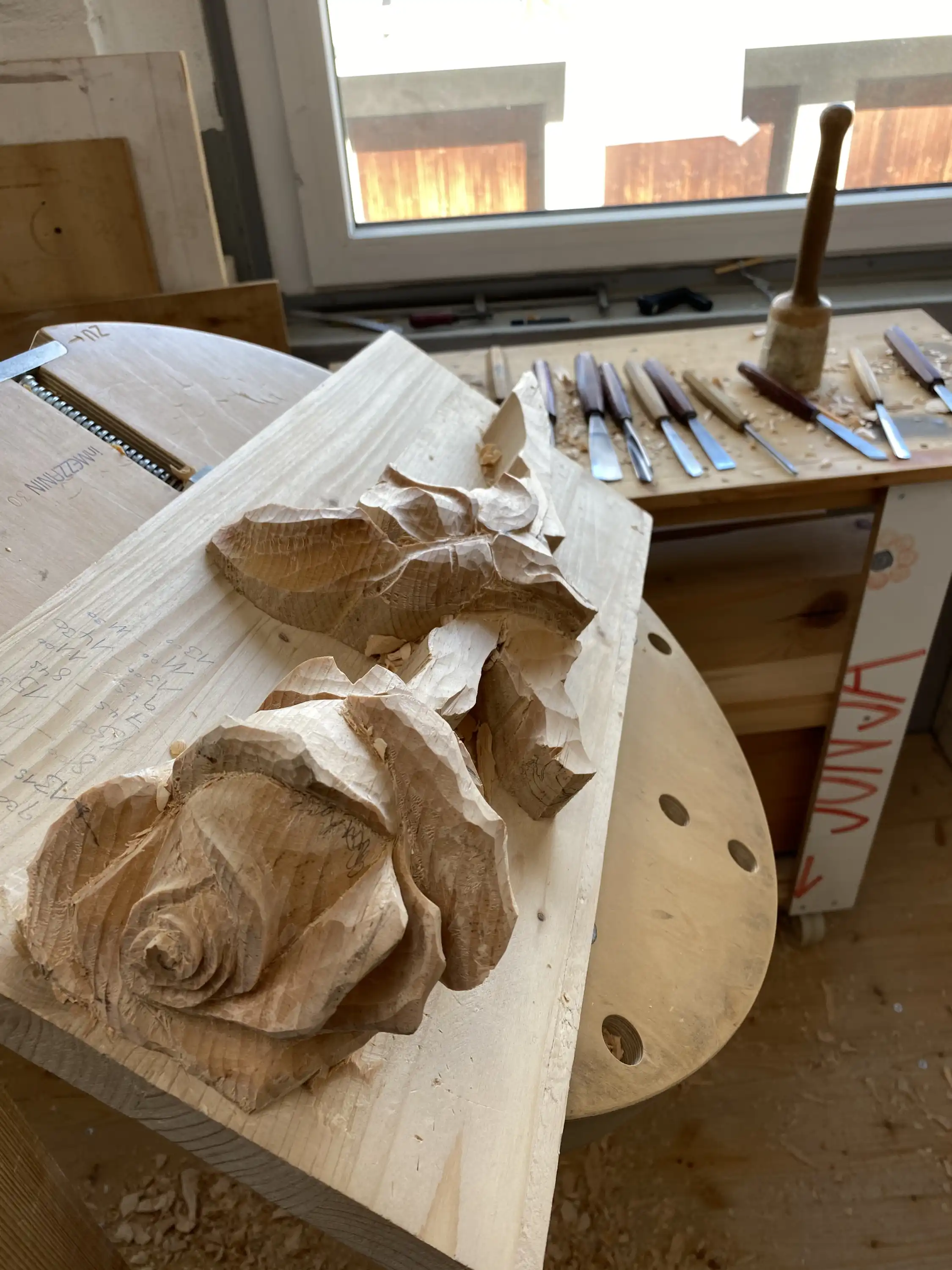 geschnitzte Rose aus Arvenholz für die Wanderausstellung des Verband Schweizer Holzbildhauer, 2020