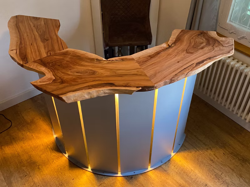 auf Mass hergestellte Barabdeckung aus Pflaumenholz, geölt und gewachst